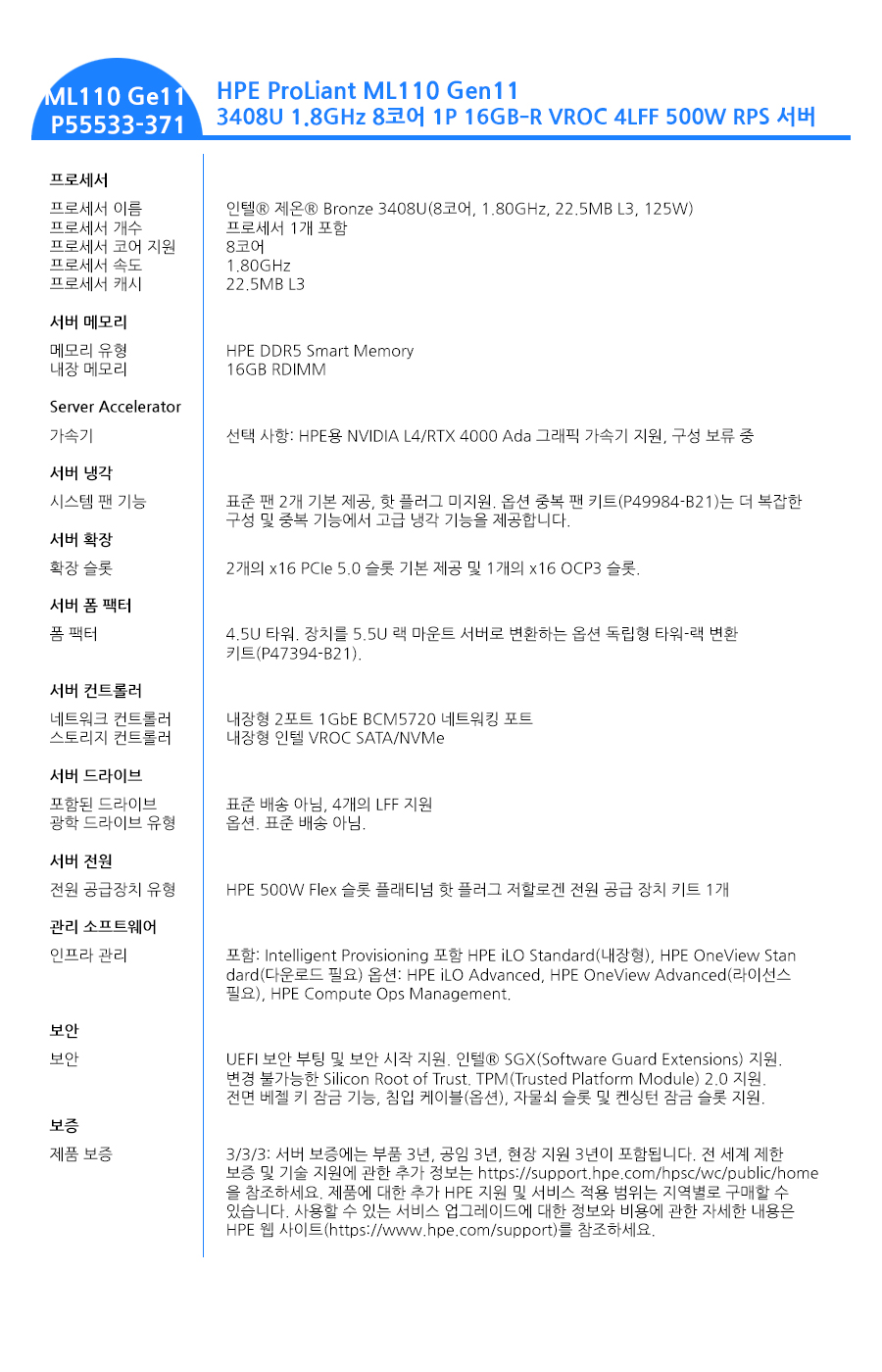 • HDD : NO-HDD 옵션구매 (4 LFF drives are supported )