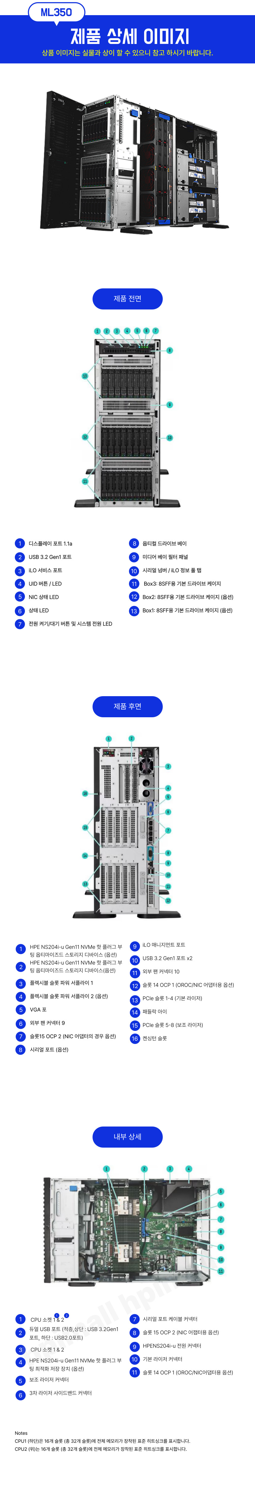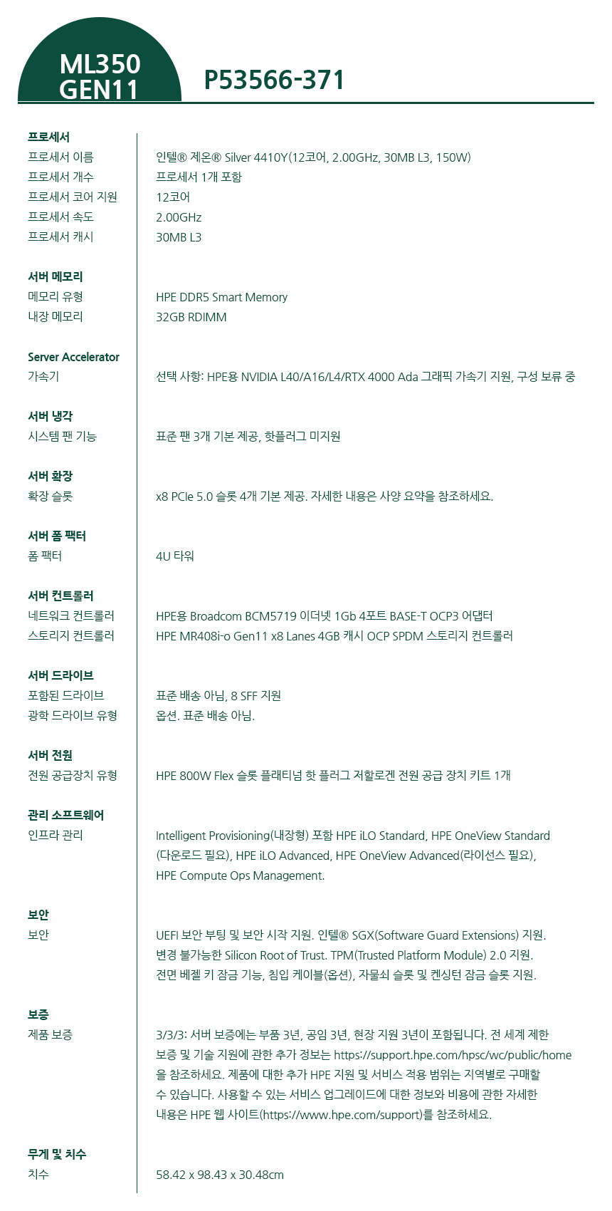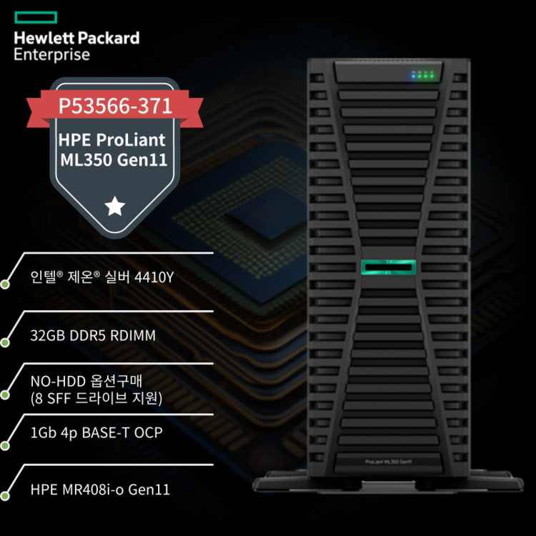 • RAID :  HPE MR408i-o Gen11 x8레인 4GB 캐시 OCP SPDM 스토리지 컨트롤러 기본 제공.