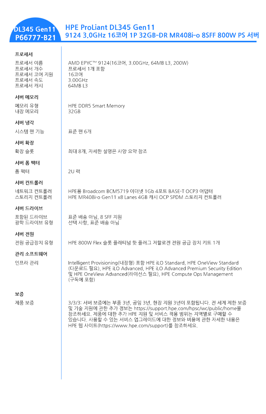 - Processor : AMD EPYC™ 9124(16코어, 3.00GHz, 64MB L3, 200W)