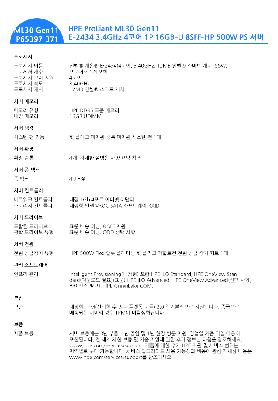 - Processor : 인텔® 제온® E-2434(4코어, 3.40GHz, 12MB 인텔® 스마트 캐시, 55W)