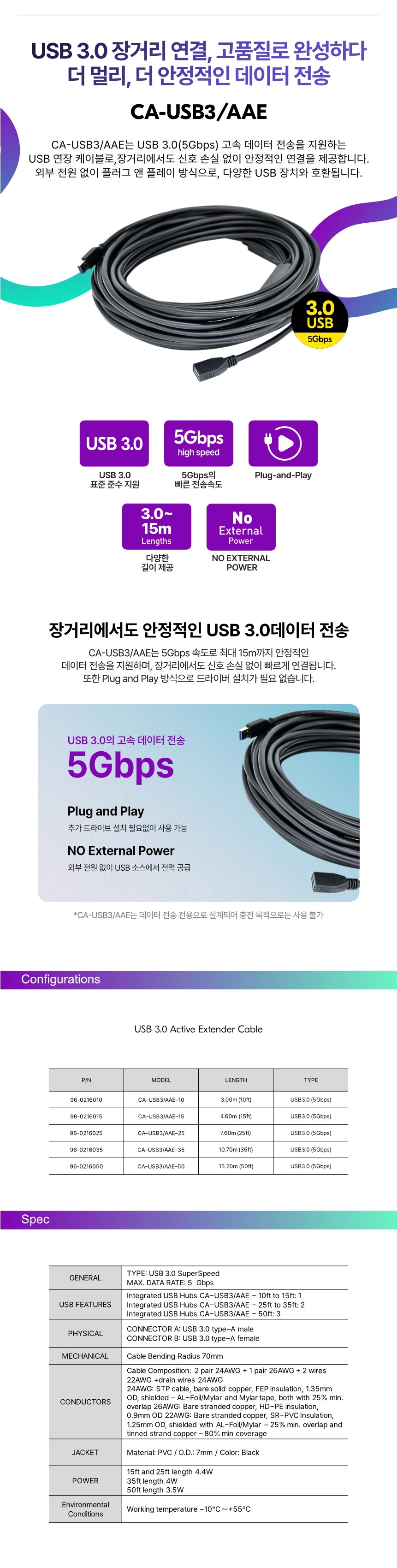 프리미엄 USB 3.0 SuperSpeed 연장 케이블