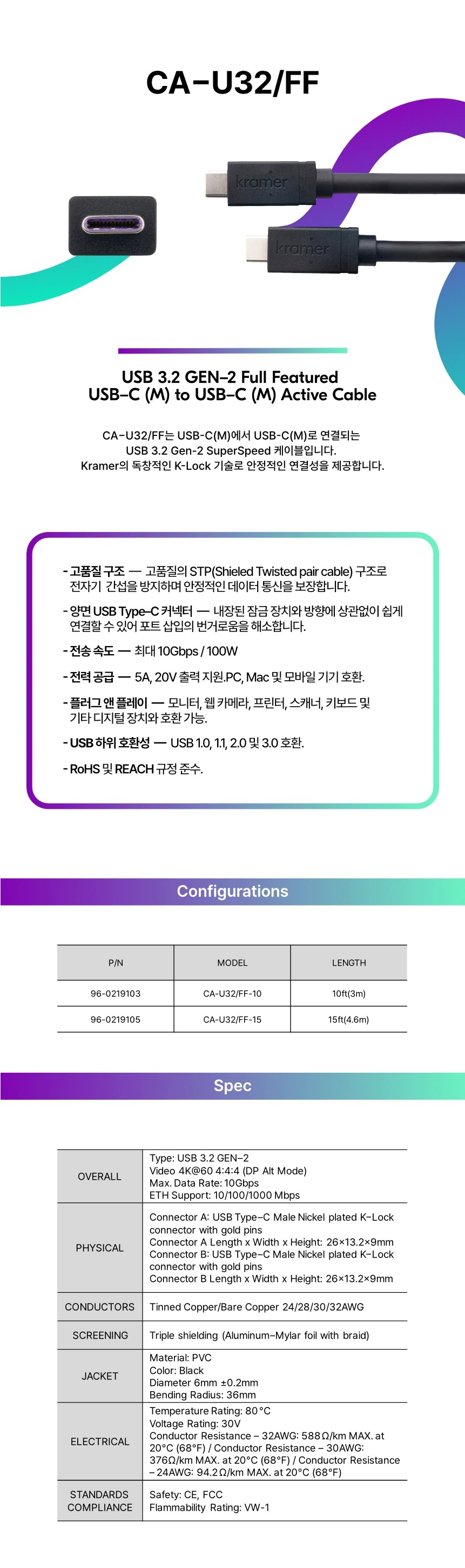 • USB 3.2 Gen−2 SuperSpeed+ Active 케이블로 10Gbps 전송 속도 제공