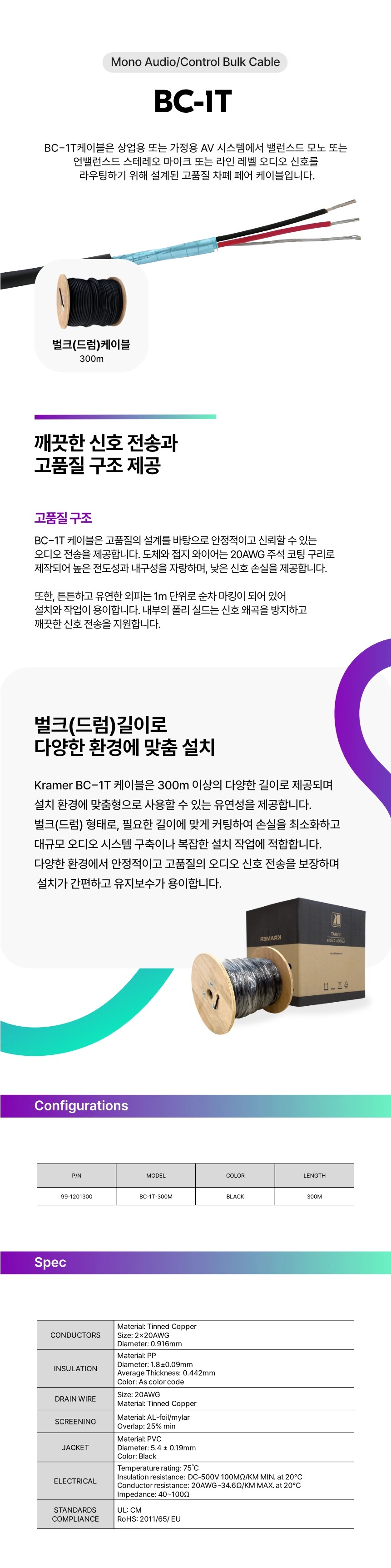BC−1T케이블은 상업용 또는 가정용 AV 시스템에서 밸런스드 모노 또는 언밸런스드 스테레오 마이크 또는 라인 레벨 오디오 신호를 라우팅하기 위해 설계된 고품질 차폐 페어 케이블입니다.