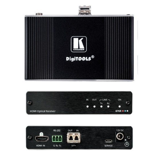 676R은 호환 송신기에서 전송된 광 신호를 수신하여 HDMI 및 RS−232 신호로 변환합니다. 676R에는 멀티모드 SFP+ 트랜시버가 포함되어 있지만 단일 모드 SFP+ 트랜시버와 같은 Kramer 인증 SFP+ 트랜시버와 함께 사용할 수 있습니다.