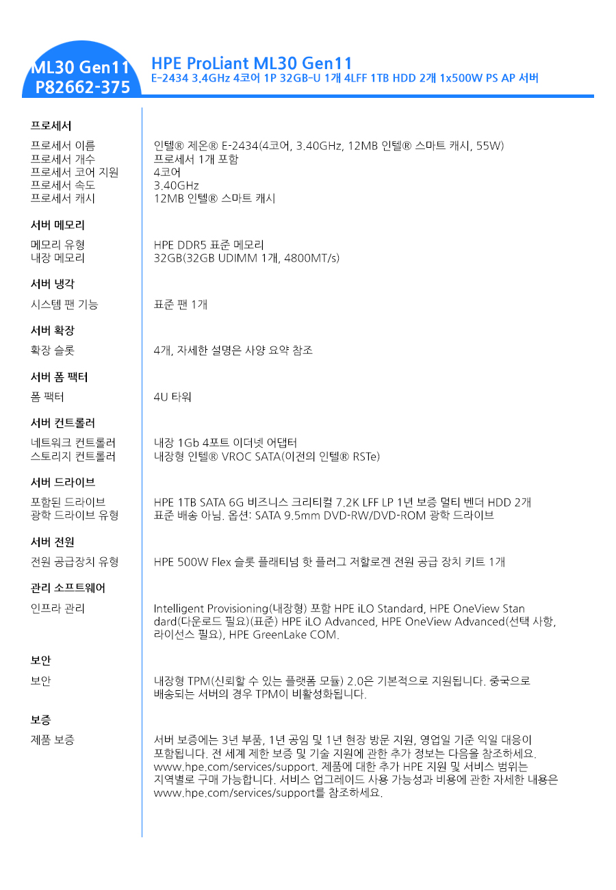 - Processor : 인텔® 제온® E-2434(4코어, 3.40GHz, 12MB 인텔® 스마트 캐시, 55W)