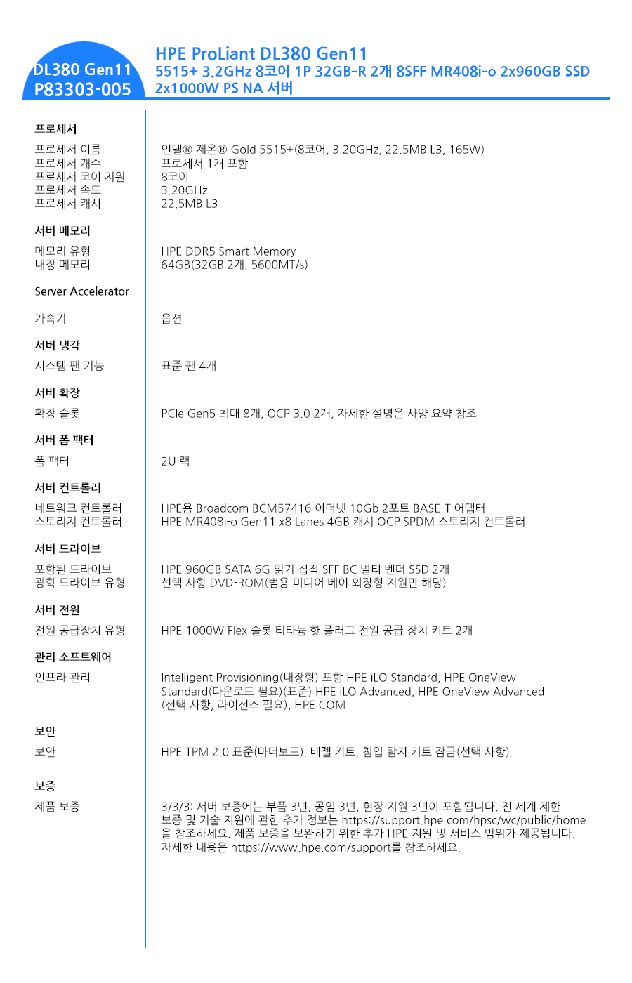 - Storage Controller : HPE MR408i-o Gen11 x8 Lanes 4GB 캐시 OCP SPDM 스토리지 컨트롤러