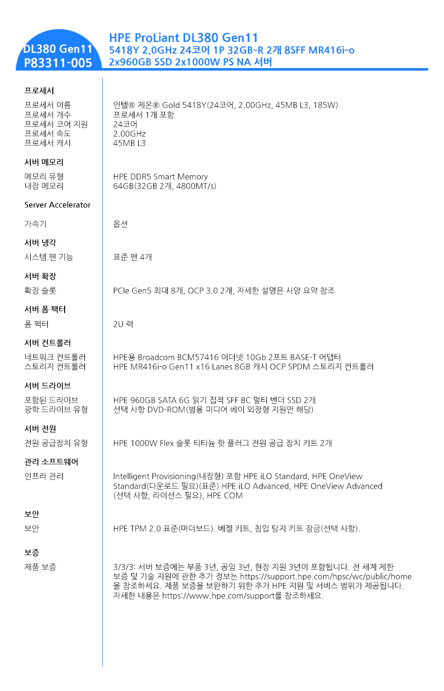 - Processor : 인텔® 제온® Gold 5418Y(24코어, 2.00GHz, 45MB L3, 185W)