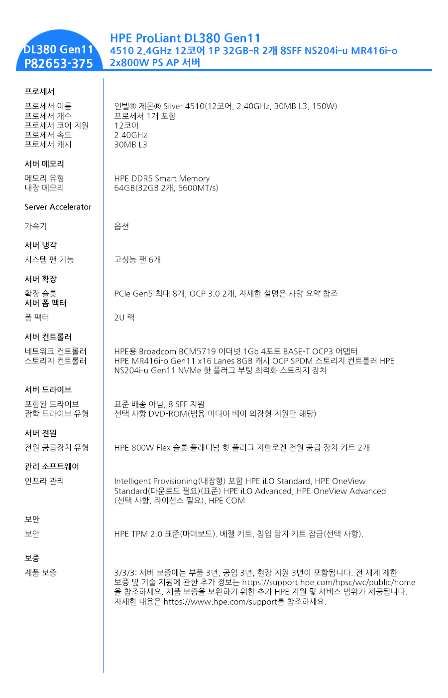 - Storage Controller : HPE MR416i-o Gen11 x16 Lanes 8GB 캐시 OCP SPDM 스토리지 컨트롤러 HPE NS204i-u Gen11 NVMe 핫 플러그 부팅 최적화 스토리지 장치