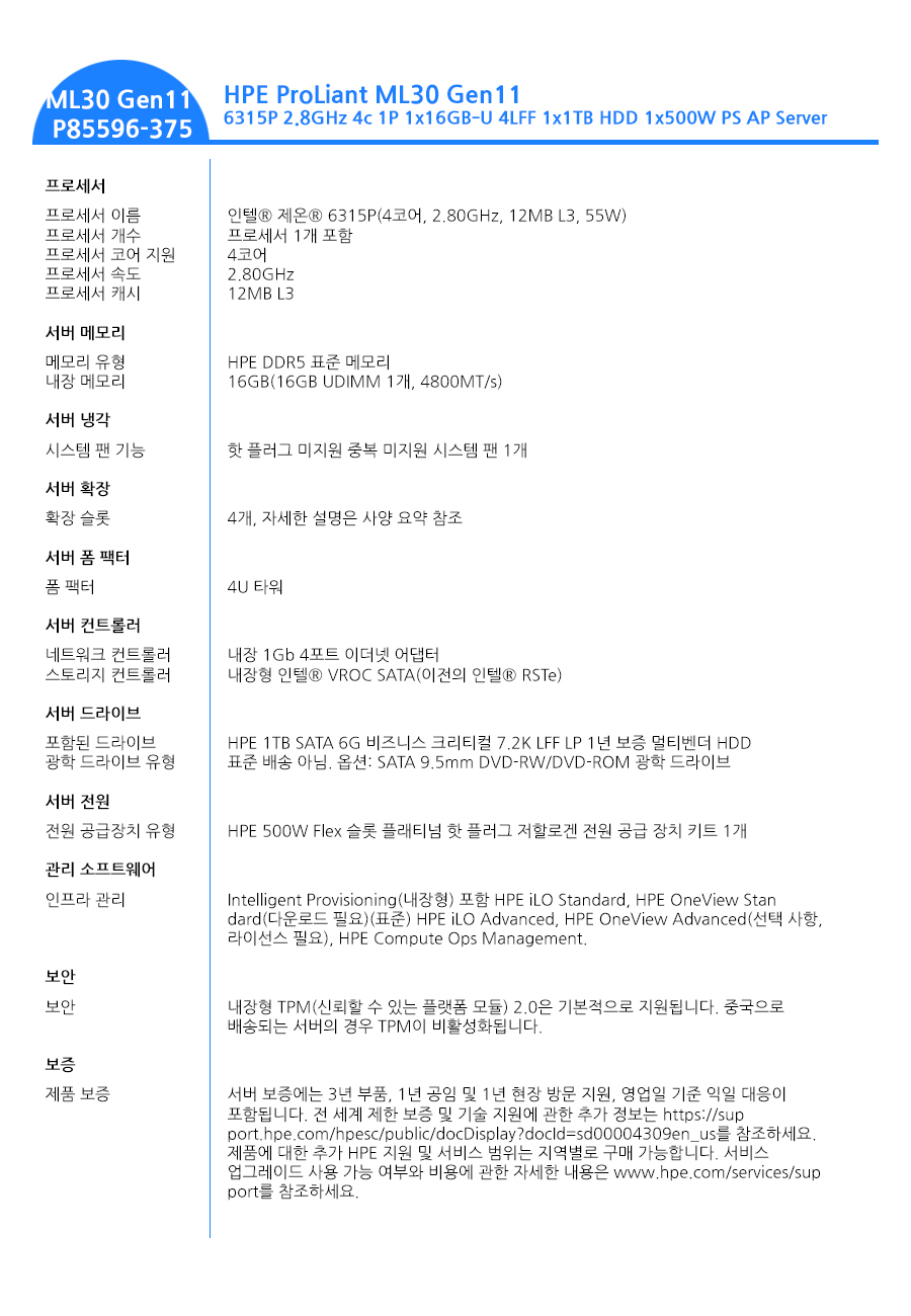 - Processor : 인텔® 제온® 6315P(4코어, 2.80GHz, 12MB L3, 55W)