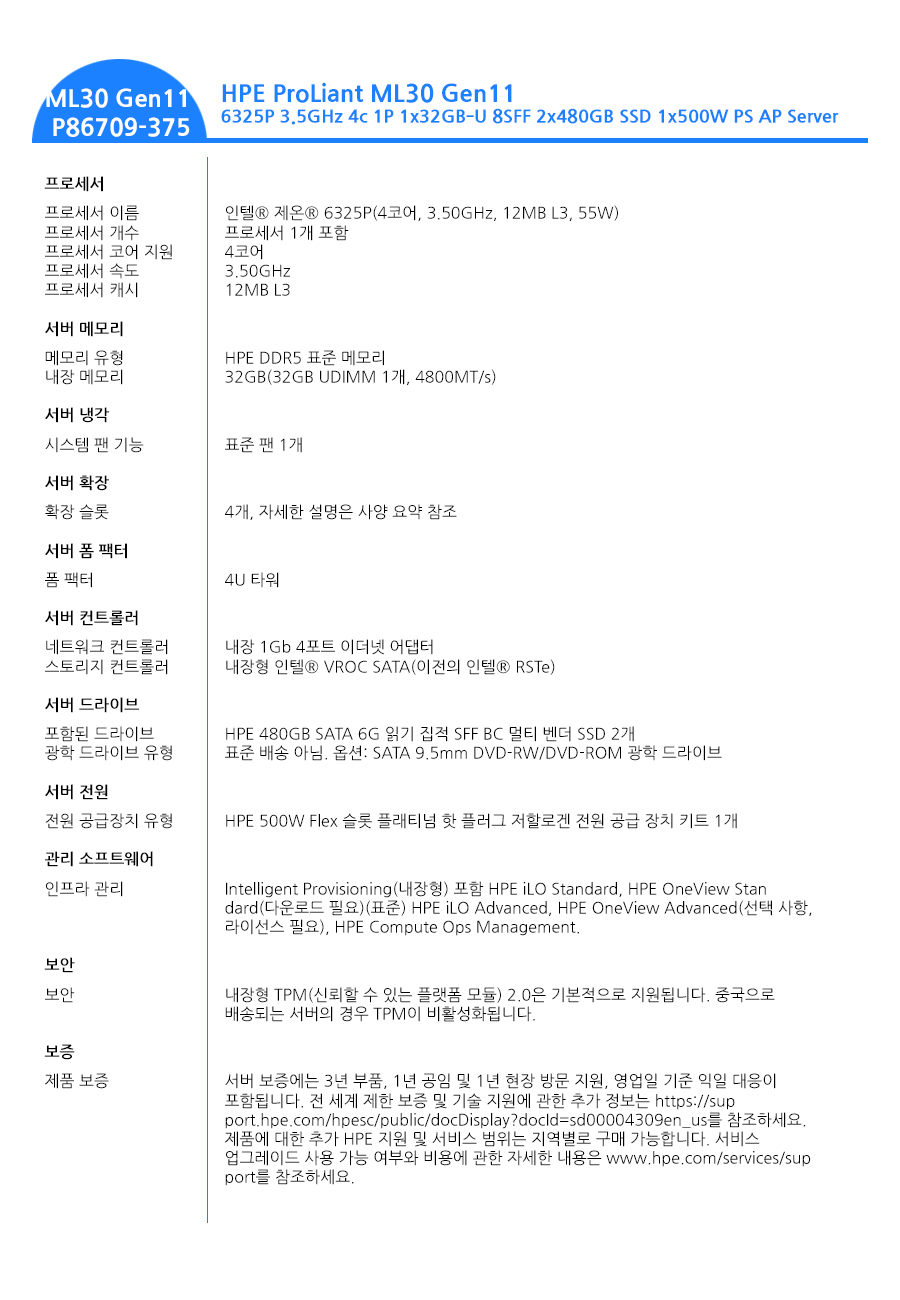 - Processor : 인텔® 제온® 6325P(4코어, 3.50GHz, 12MB L3, 55W)