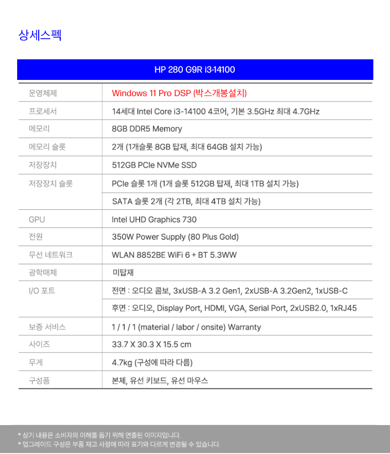HP 프로타워 280 G9R B1HQ7PT i3-14100 8GB 512GB SSD Win11 Pro